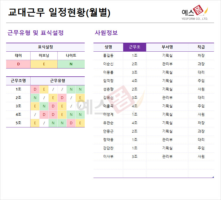 ▼▼예스폼 월별 교대근무 일정현황 엑셀템플릿▼▼