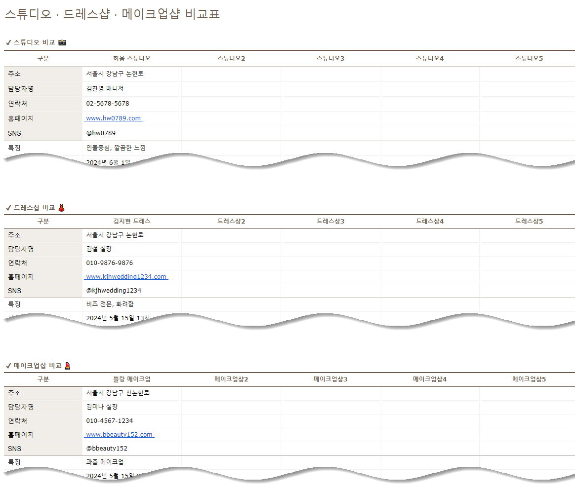 스튜디오, 드레드샵, 메이크업샵별 특징을 기재하여 비교할 수 있는 스드메 비교표를 제공합니다.