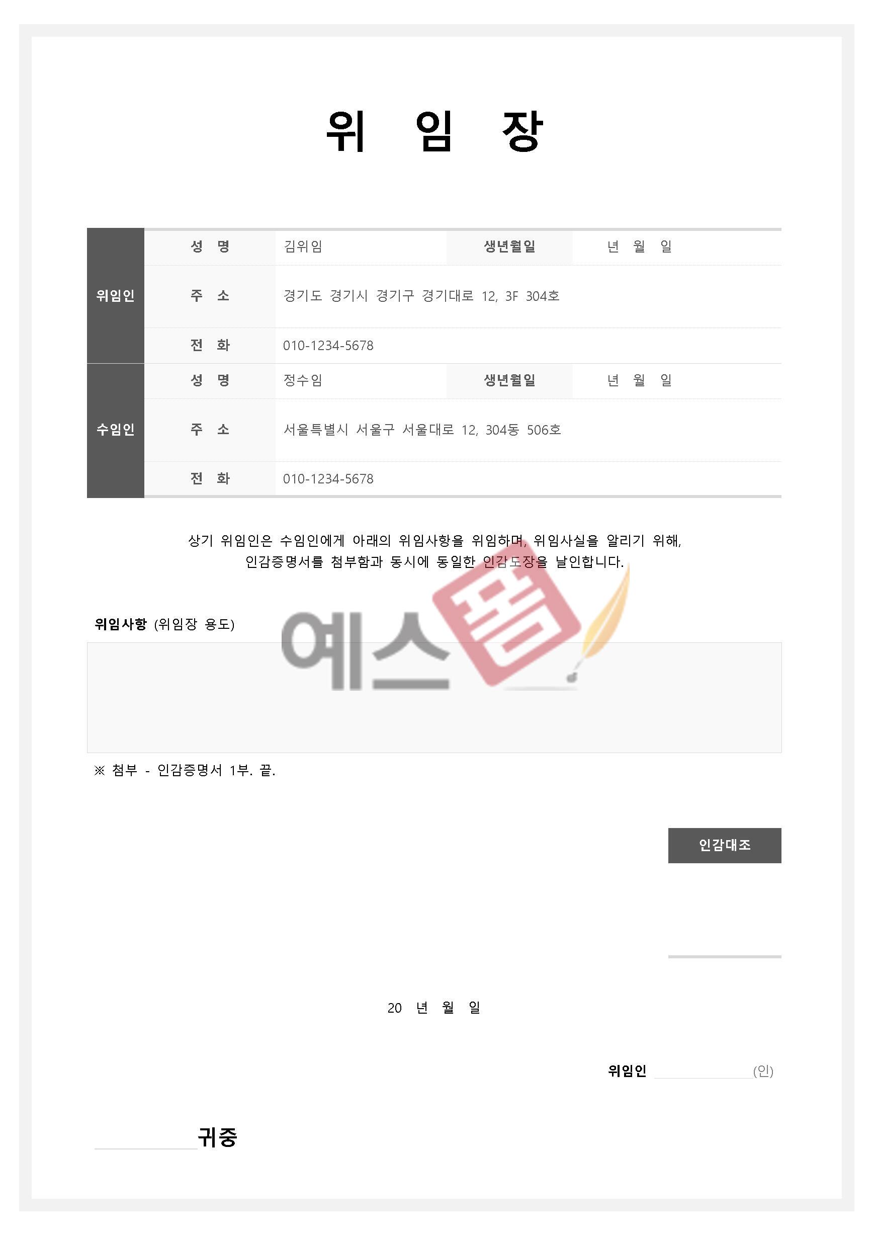 - 인장 사용: 위임장에 날인하는 도장은 인감증명서에 등록된 도장과 일치해야 합니다.
