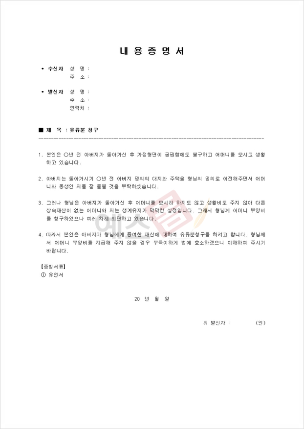 어머니를 부양하고 있으나 생활이 어려워 아버지가 형님에게 증여한 재산에 대하여 유류분 청구를 하겠다는 내용 증명서입니다.