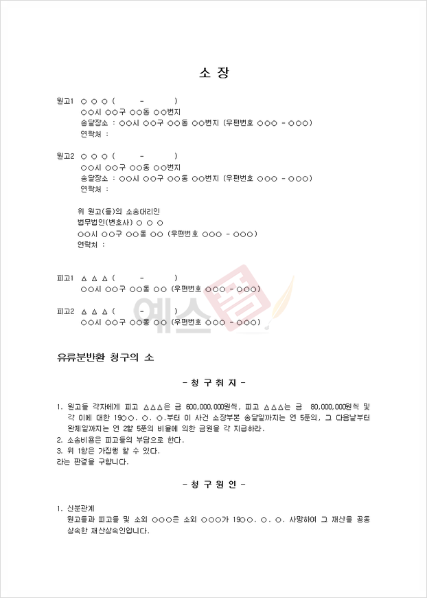 유류분 반환 청구를 진행할 때 활용하기 좋은 예스폼 유류분 반환 청구의 소 양식입니다.
