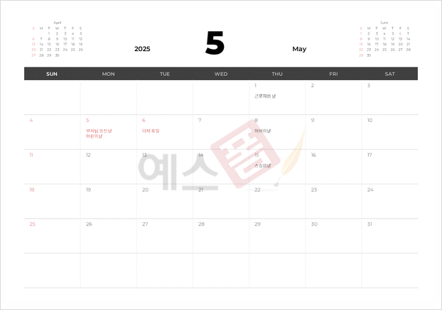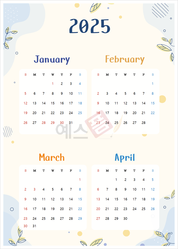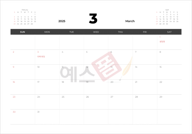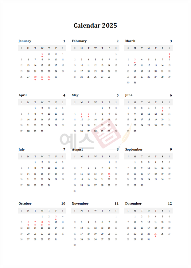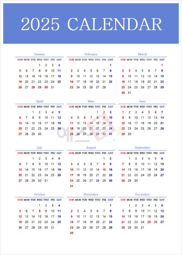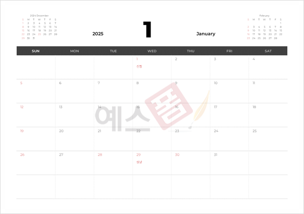 2025년이 다가오고 있는 이 시점에서 새해를 맞이하기 위한 준비가 한창인 분들이 많으실 텐데요. 특히 일정을 효과적으로 관리하는 데 도움을 줄 수 있는 달력 서식은 필수 아이템입니다. 달력 엑셀은 개인의 일정을 관리하는데 뿐만 아니라 스케줄을 정리하는데도 큰 도움이 됩니다. 오늘은 저희 예스폼에서 새롭게 업데이트한 2025년 달력 양식 소개를 드릴 예정입니다. 예스폼에서 준비한 2025년 달력 템플릿은 서식, 엑셀, 템플릿, 구글 문서 등 다양한 포맷으로 제공되니 원하는 디자인의 달력 다운로드하고 내년도 효율적인 계획 세우기와 목표 달성해 보세요.
