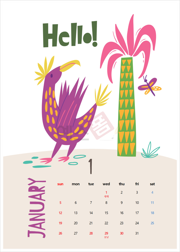 다양한 색상의 뱀 캐릭터와 꽃으로 밝고 경쾌한 분위기를 연출할 수 있는 2025년 달력입니다. 심플한 레이아웃을 유지하면서도 각 월을 상단 중앙에 크게 배치하여 시각적으로 명확한 느낌을 줍니다. 달력 상단에 이전 달과 다음 달의 축소된 달력이 배치되어 있어 일정을 비교하거나 미리 확인하는 데 유용합니다.