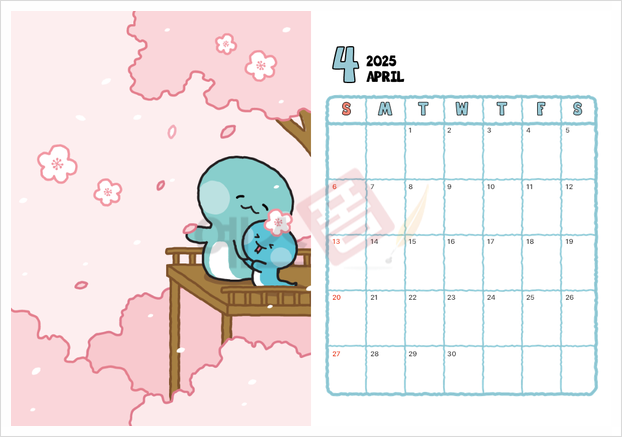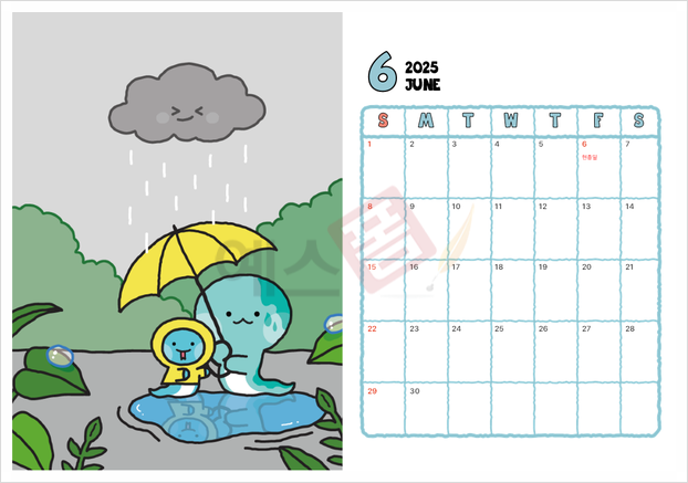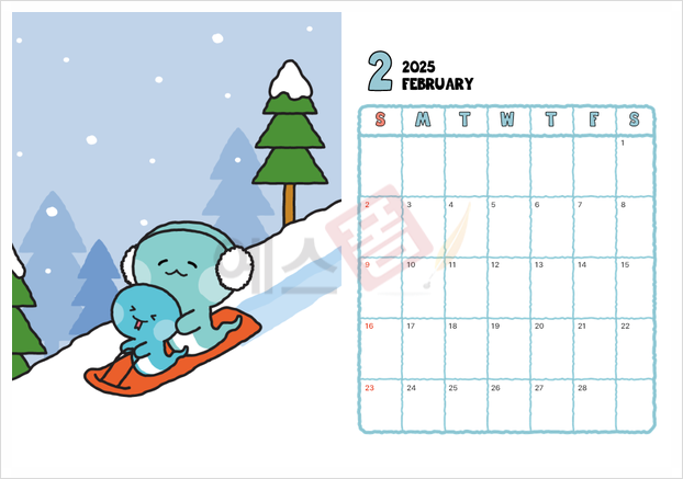 귀여운 캐릭터와 배경 일러스트가 특징인 2025년 달력입니다. 각 월마다 계절에 맞는 이미지가 좌측에 배치되어 있어 따뜻하고 생동감 있는 분위기를 줄 수 있습니다. 문서 우측에 배치된 달력은