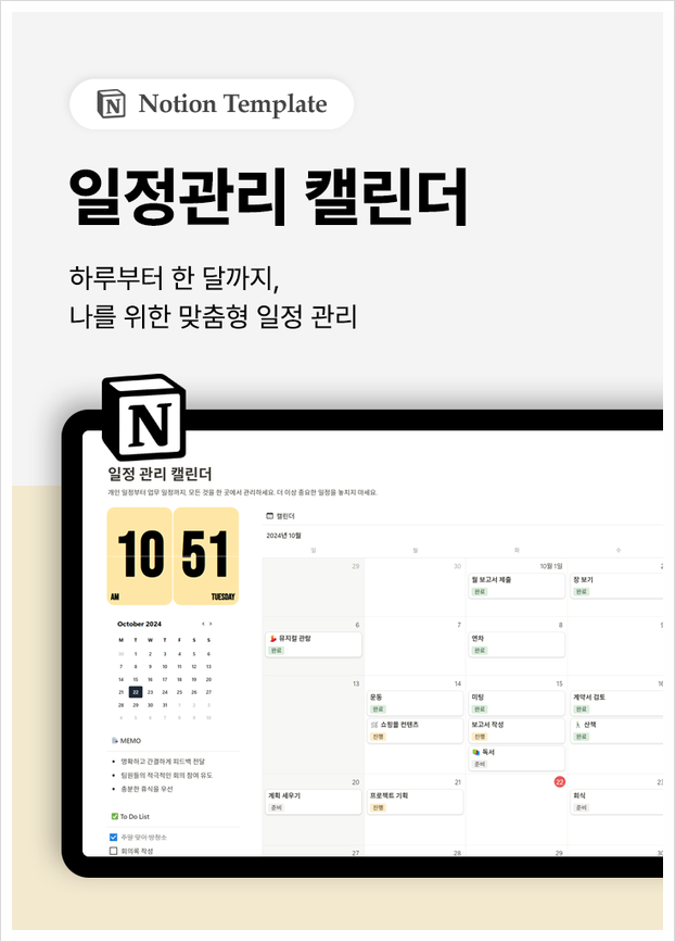사용자가 한눈에 자신의 일정을 확인하고 체계적으로 관리할 수 있도록 설계된 노션 템플릿입니다. 월간 캘린더를 통해 한 달간의 일정을 한눈에 파아갈 수 있어 업무와 일정을 효율적으로 운영할 수 있습니다. 금주 일정 확인 기능을 통해 이번 주에 집중해야 할 업무를 몰아볼 수 있어 주 단위로 우선순위를 설정하는데 유용합니다. 진행 상태별 리스트에는 각 일정의 진행 상태를 쉽게 파악할 수 있어 관리와 작업 진행 상태를 동시에 확인하고 싶은 사용자에게 적합니다.