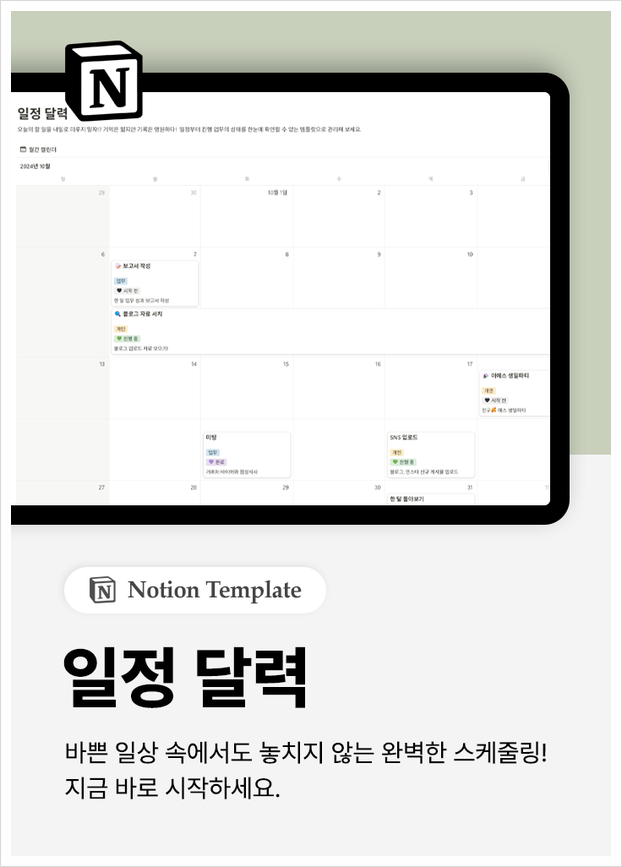 사용자가 한눈에 자신의 일정을 확인하고 체계적으로 관리할 수 있도록 설계된 노션 템플릿 입니다.월간 캘린더를 통해 한 달간의 일정을 한눈에 파악할 수 있어 업무와 일정을 효율적으로 운