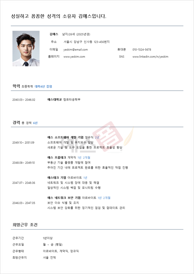 예스폼에서 제공하는 이력서 양식은 신입사원 이력서부터 경력직 이력서, 전문직 이력서 등 구직자가 속한 분야와 경력 수준에 맞게 본인의 이력서를 맞춤화할 수 있도록 제작되었는데요. 현재 취업 시장에서 선호하는 최신 트렌드를 반영한 디자인을 채택하여 다양한 포맷과 디자인으로 제공 중입니다. 각 이력서 서식에는 각 상황에 맞는 이력서 예시가 포함되어 있어 이력서 작성 과정에서 발행할 수 있는 여러분의 어려운 상황을 최소화하고 구직자 본인의 경력과 역량을 어떻게 효과적으로 배열하고 소개할 수 있는지에 대한 가이드라인을 제공합니다.