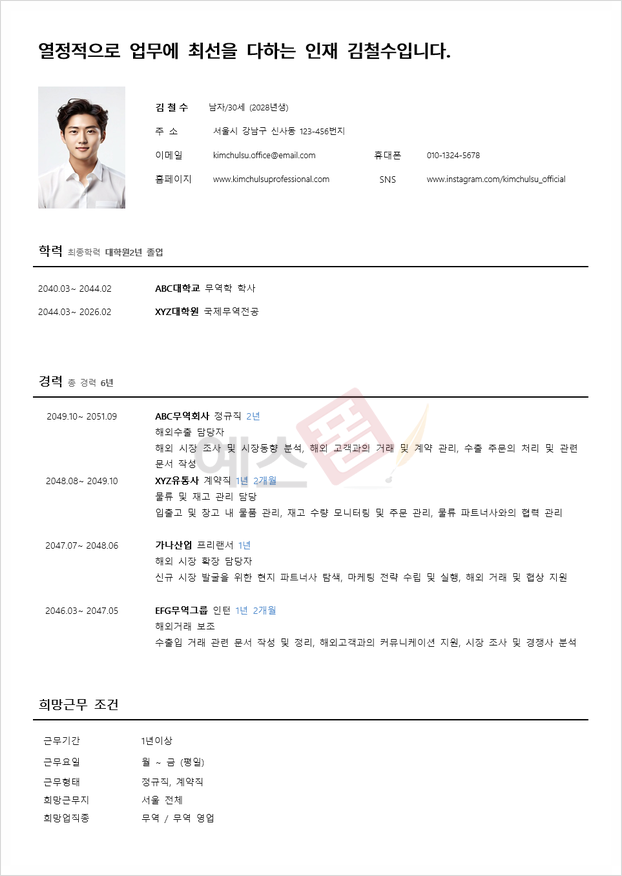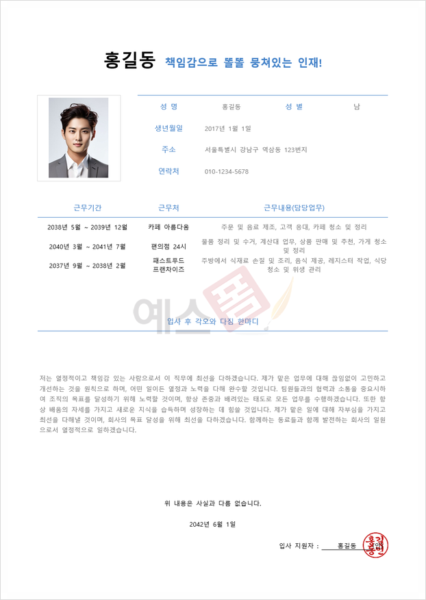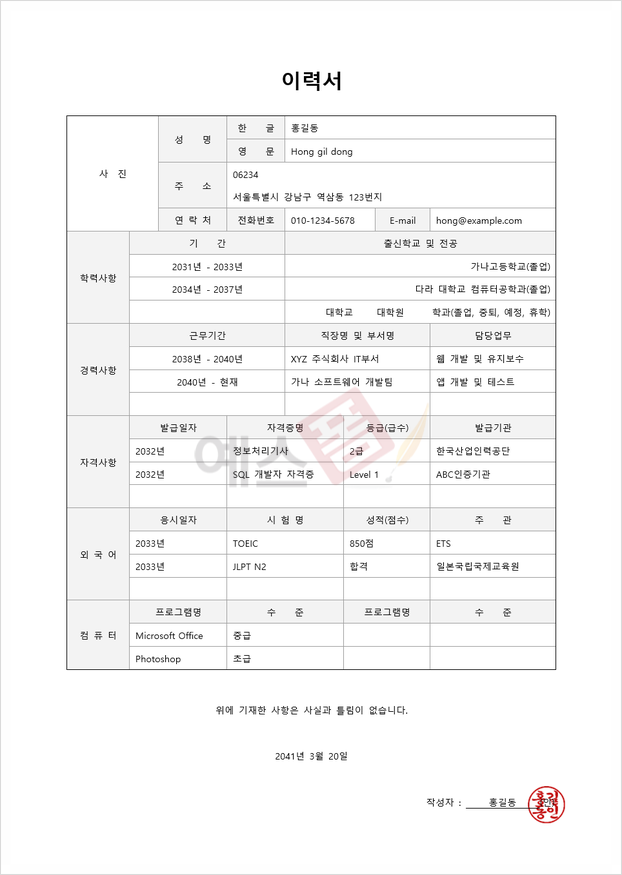 신입사원용 이력서는 경력이 부족하기 때문에 학력, 학교에서의 활동, 자원봉사 경험 등을 중점적으로 다룹니다. 중요한 것은 단순히 활동을 나열하는 것이 아니라, 해당 활동을 통해 어떤 역량을 개발했고, 어떻게 직무에 적용할 수 있는지를 보여주는 것입니다. 예를 들어, 팀 프로젝트에서의 리더십 경험, 문제 해결 능력, 시간 관리 능력 등이 그 예입니다. 또한, 신입사원용 이력서에서는 학습 의지와 성장 가능성을 강조하는 것이 중요합니다.