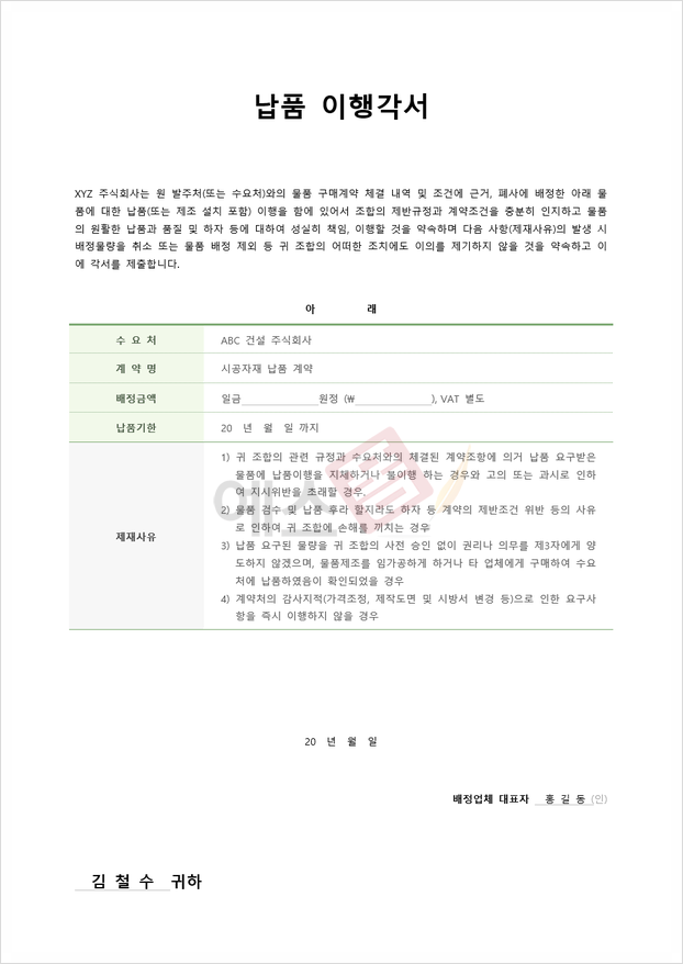 거래 상대방과의 납품 계약에서 양측이 서로의 책임과 의무를 명확히 하기 위해 사용되는 납품 이행 각서 예시 및 양식입니다. 납품 대상, 납품금액, 납품기한, 제재 사유 등을 명확히 기재할 수 있습니다. 특정 기업 간 납품 이행을 확인하는 내용이 예시로 포함되어 있습니다.