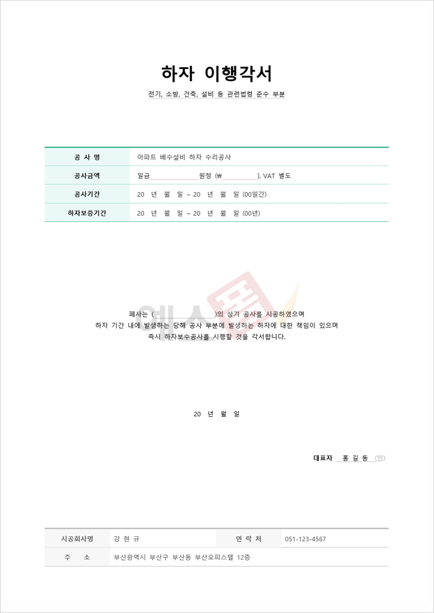 하자 이행 각서(하자 보수)