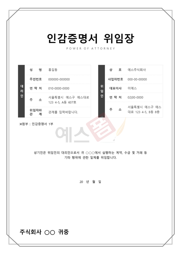 인감증명서에 관한 계약, 수금, 거래 등 일체 사항을 위임하기 위한 서식입니다. 대리인 정보와 위임인 정보 및 위임 내용을 작성하는 인감증명서 위임장인데요. 인감증명서 서식이 필요한 분들께서는 쉽고 간편하게 제작되어 있는 예스폼의 인감증명서 위임장을 사용해 보시기 바랍니다.