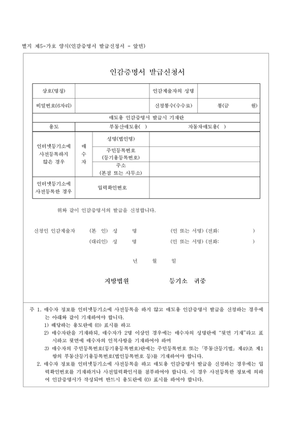 인감증명서 발급신청서 문서입니다. 대한민국 법원 인터넷 등기소의 인감증명서 발급신청서 양식입니다.