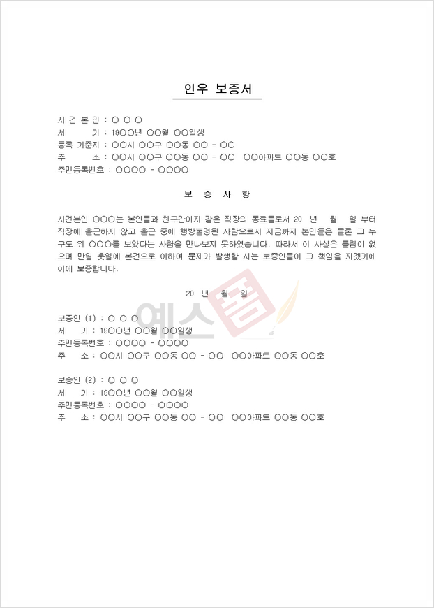 예스폼 인우보증서(실종선고 신청하는 경우)