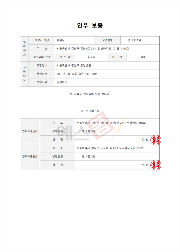 예스폼 인우보증서(사망사실보증)