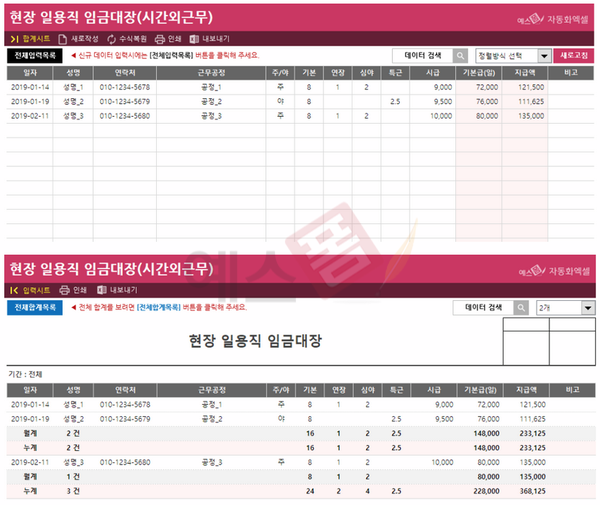 일자, 성명, 연락처, 근무공정, 주/야, 기본, 연장, 심야, 특근, 시급, 기본급(일), 지급액, 비고를 입력할 수 있으며 입력된 데이터값을 근간으로 기본급(일), 지급액을 자동산출 할 수 있도록 구성