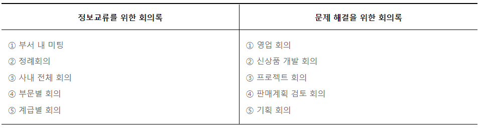 회의란 어떠한 안건을 주제로 참석자들의 의견을 나누고 결정과 동의를 구하는 과정을 말하며, 기업이나 단체에서 회의 참석자들이 제시된 과제에 대해 의견을 교환하거나, 문제의 해결방법을 모색하는 일련의 과정을 기록하여 보존하는 문서를 회의록이라 한다.