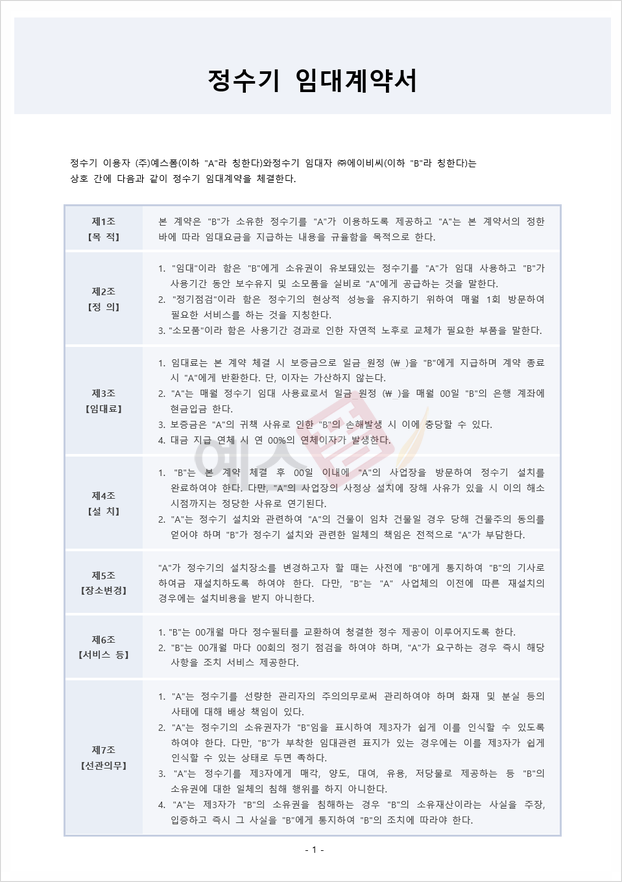 필수로 체크해야 하는 계약서 항목부터 실제 사용할 수 있는 임대계약서 양식을 소개드렸는데요. 소개드린 정수기 임대계약서, 창고 임대계약서, 표준임대계약서, 기계임대계약서, 공동주택 임대계약서, 고시원 임대계약서는 임대계약서 예시가 포함되어 있어 계약서 양식을 처음 접하시는 분도 예시를 토대로 손쉽게 규정을 수정, 변경할 수 있습니다. 임대 전 계약서를 꼼꼼하게 확인하는 것은 매우 중요하니 임대 기간, 임대료, 유지 보수, 해지 조건 등 중요한 계약서 항목들을 세심히 확인하시어 불필요한 분쟁이나 손실이 없길 바라겠습니다. 이 포스팅을 통해 여러분의 임대 계획이 무탈하게 지나가길 바랍니다. 서두르지 말고, 한 단계씩 차근차근 진행해 보세요.