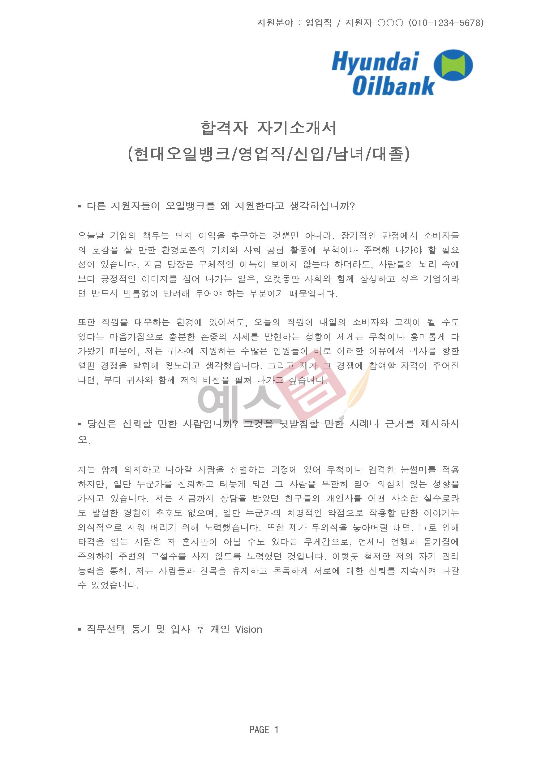 | 합격자 자기소개서 (현대오일뱅크/영업직) - 신입, 남녀, 대졸 |
