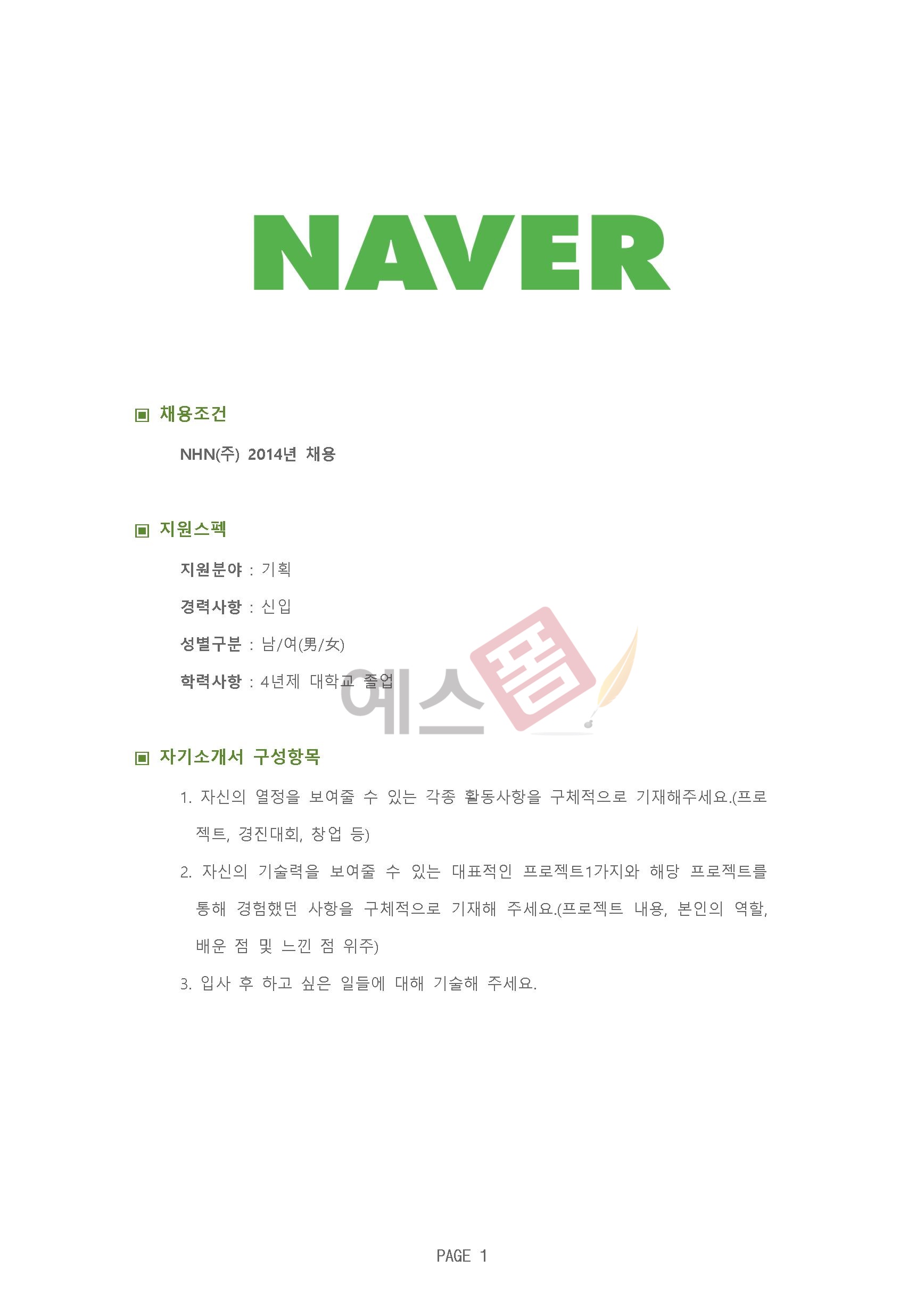 | 기업별 공채 자기소개서 (NHN/기획) 신입, 남녀, 대졸 |