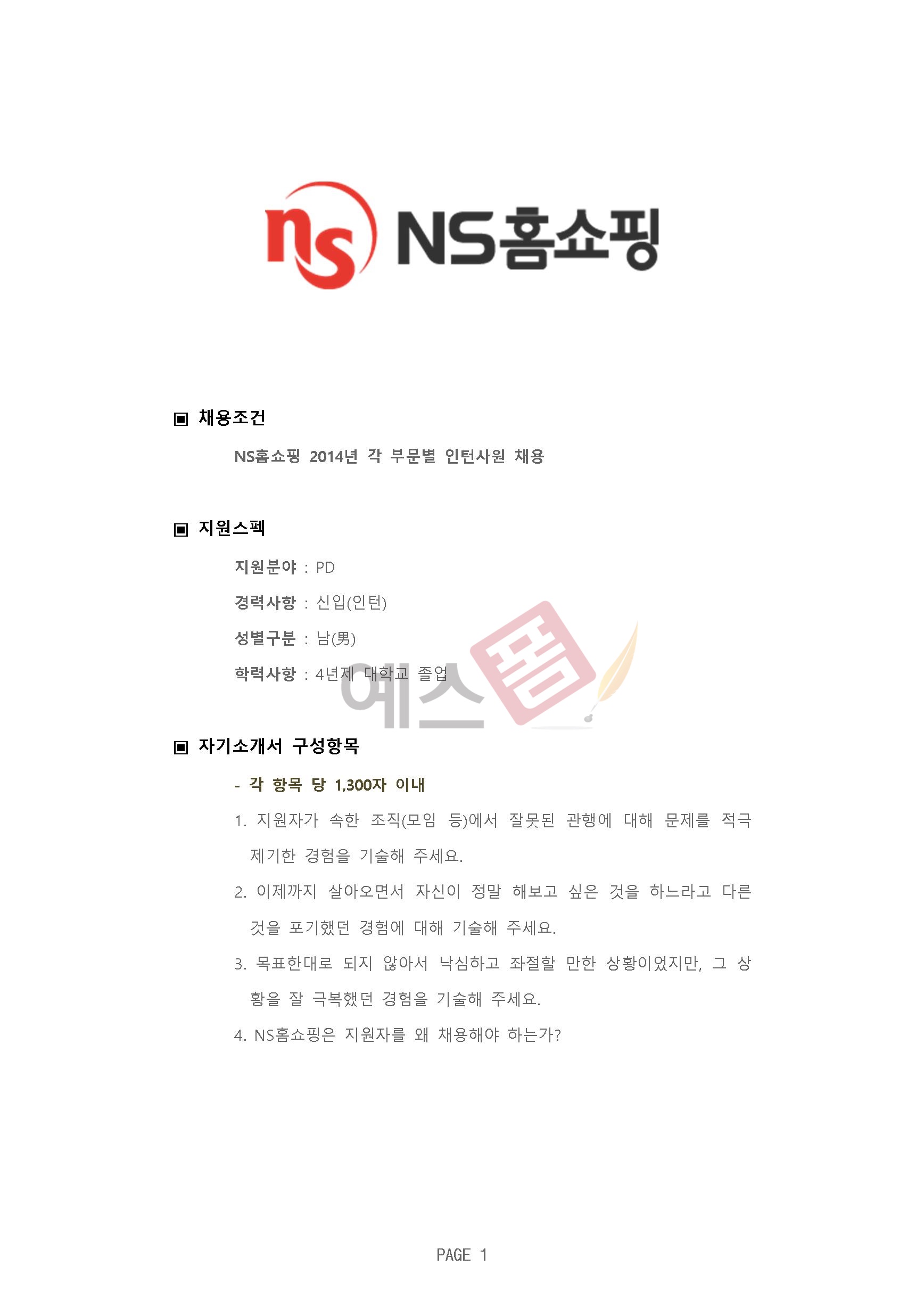 기업별 공채 자기소개서 (NS홈쇼핑/PD) 인턴, 남, 대졸 |