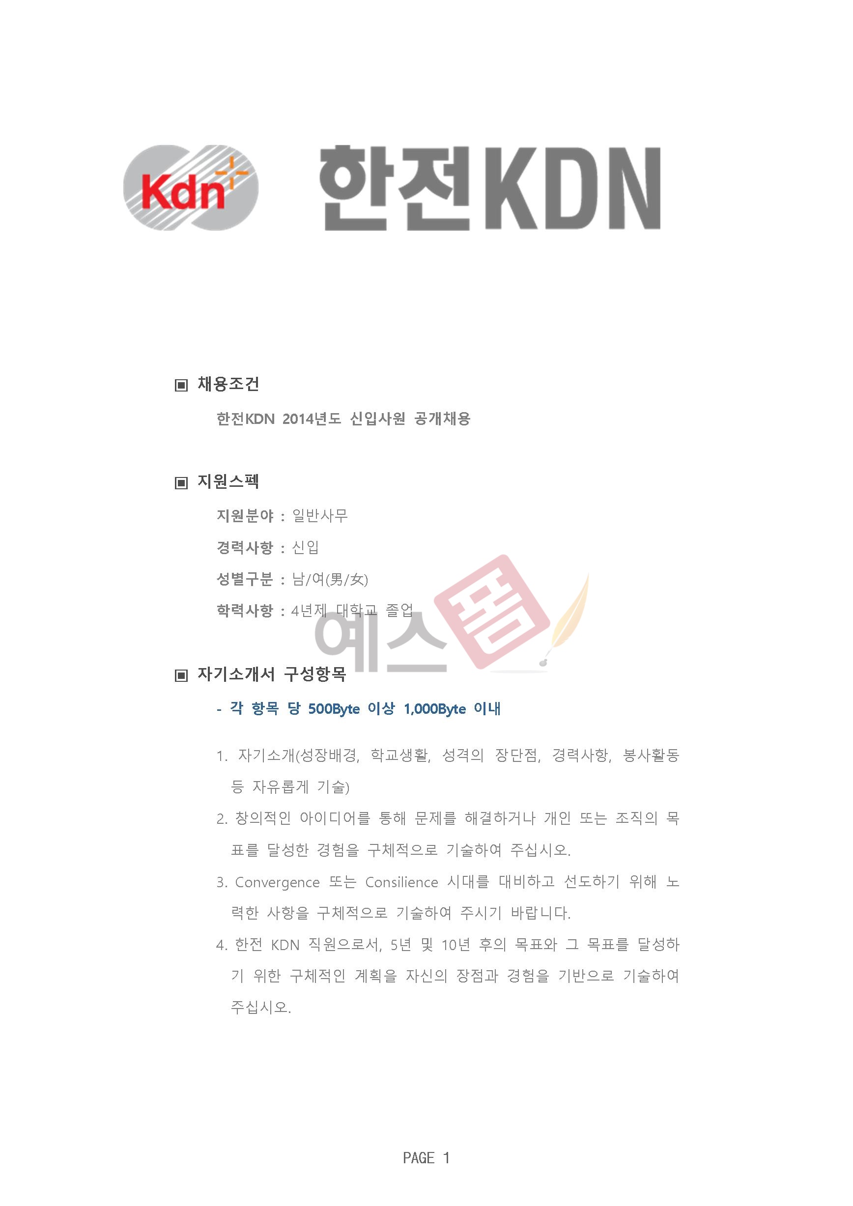 기업별 공채 자기소개서 (한전KDN/사무) 신입, 남여, 대졸 |