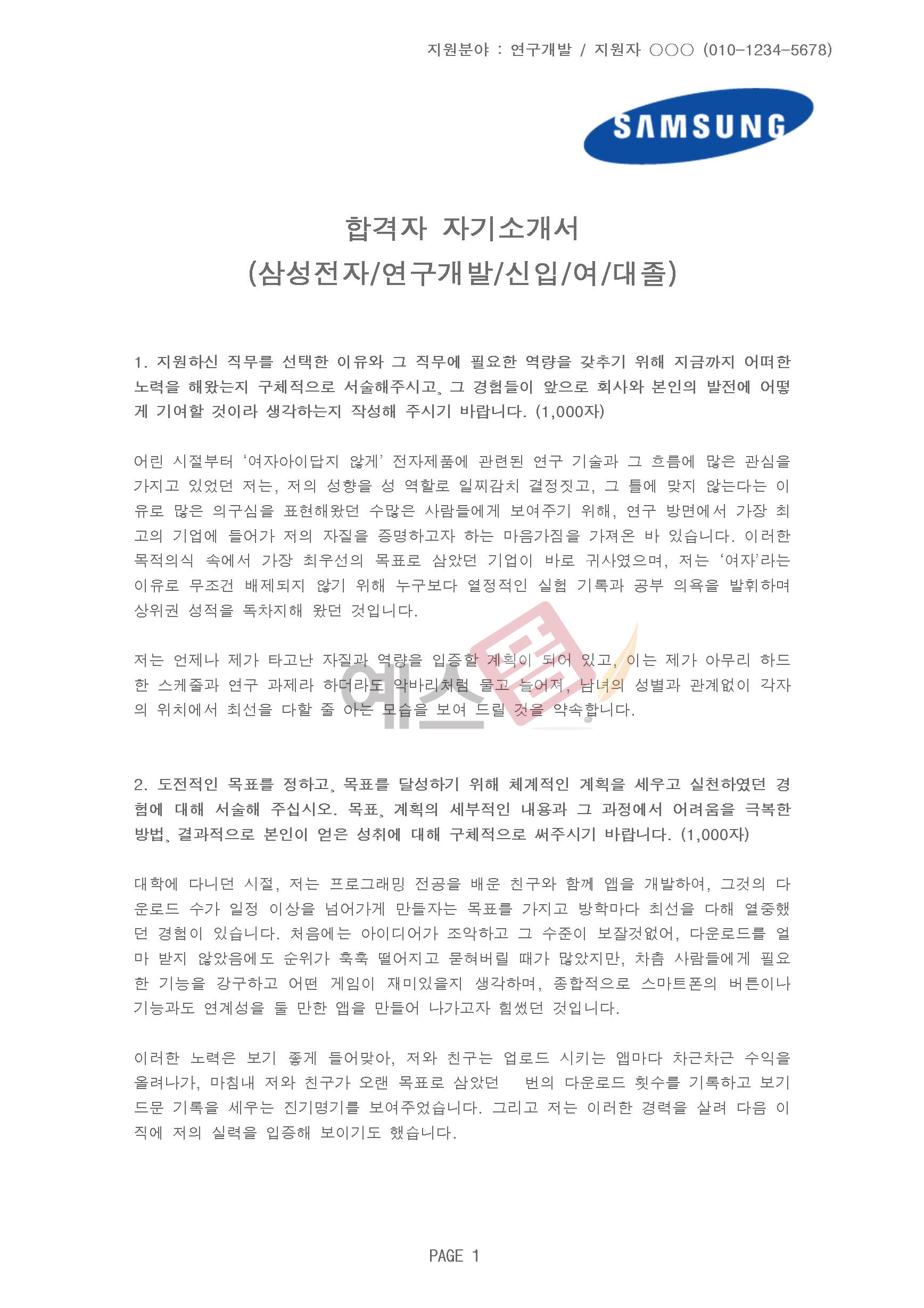 합격자 자기소개서 (삼성전자/연구개발) - 신입, 여, 대졸 |