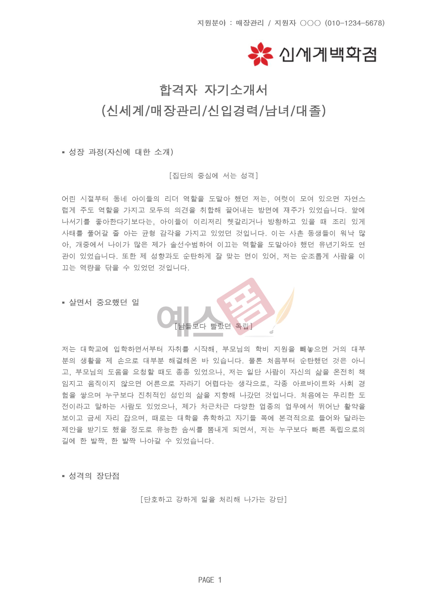 합격자 자기소개서 (신세계/매장관리) - 신입경력, 남녀, 대졸 |