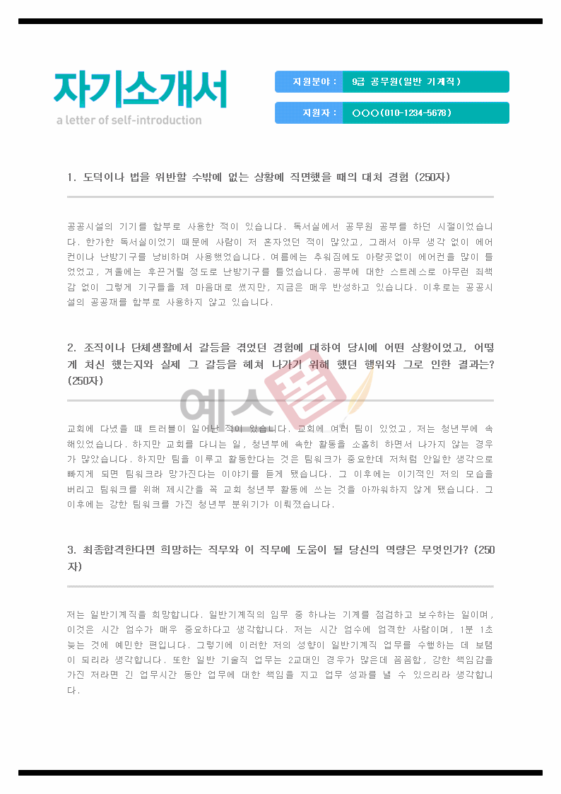 | 전문가 자기소개서 (9급공무원/일반기계직) - 신입, 남녀 |