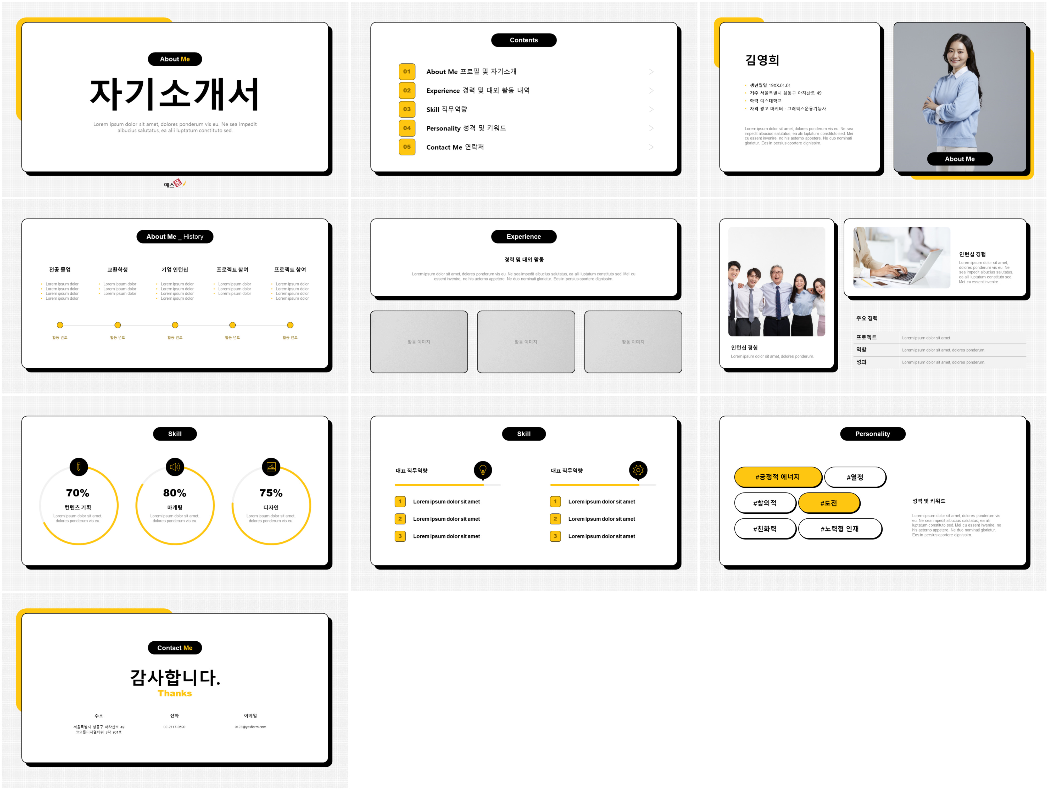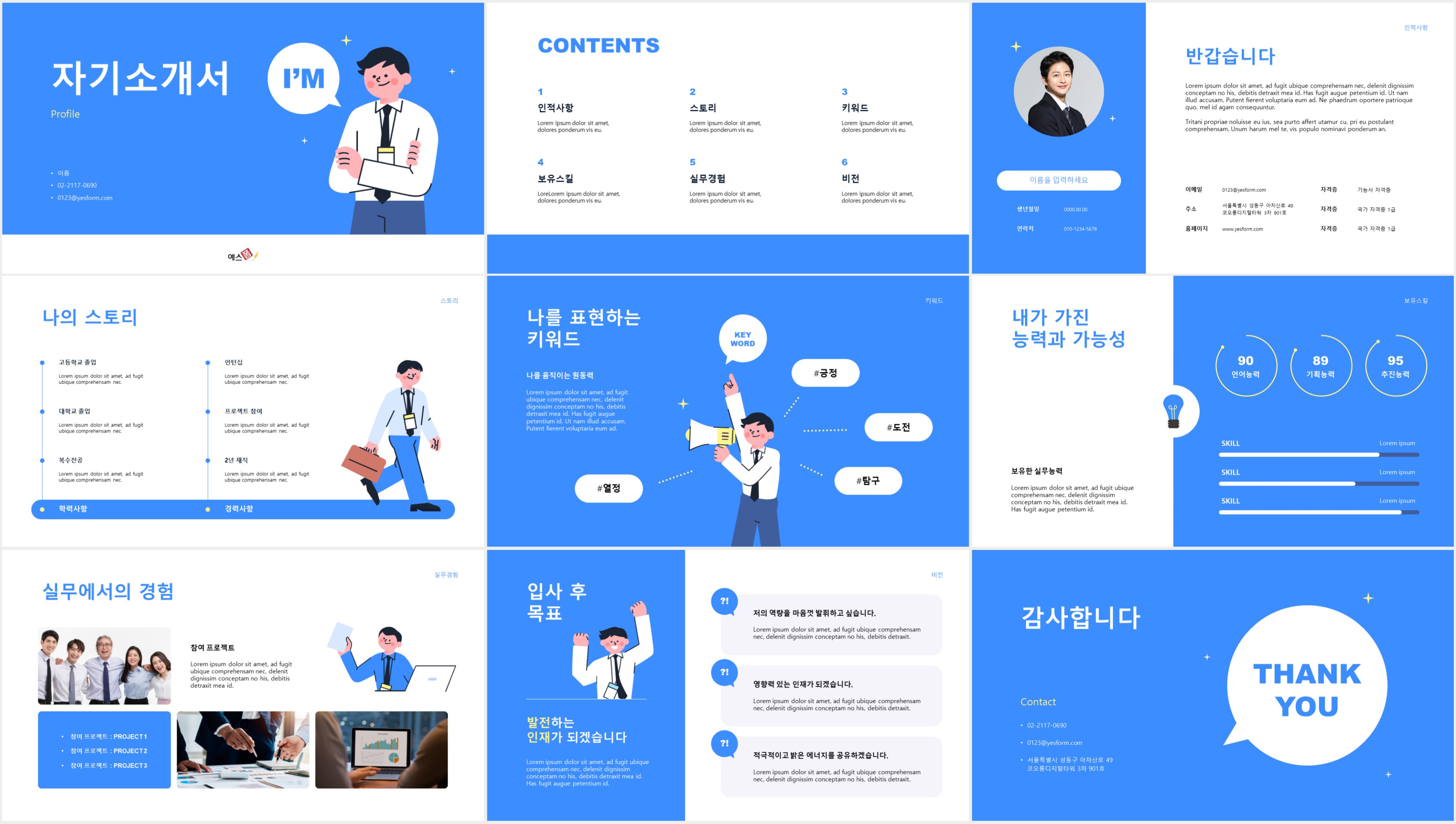 자기소개서 PPT에 들어갈 내용은 준비했는데, 다이어그램이나 이미지 배열, 폰트 설정을 어떻게 해야 할지 막막하시다면 예스폼에서 서비스하고 있는 자기소개서 PPT 양식을 활용해보세요! 내용만 입력하면 퀄리티 높은 PPT 자기소개서를 쉽게 완성하실 수 있습니다!