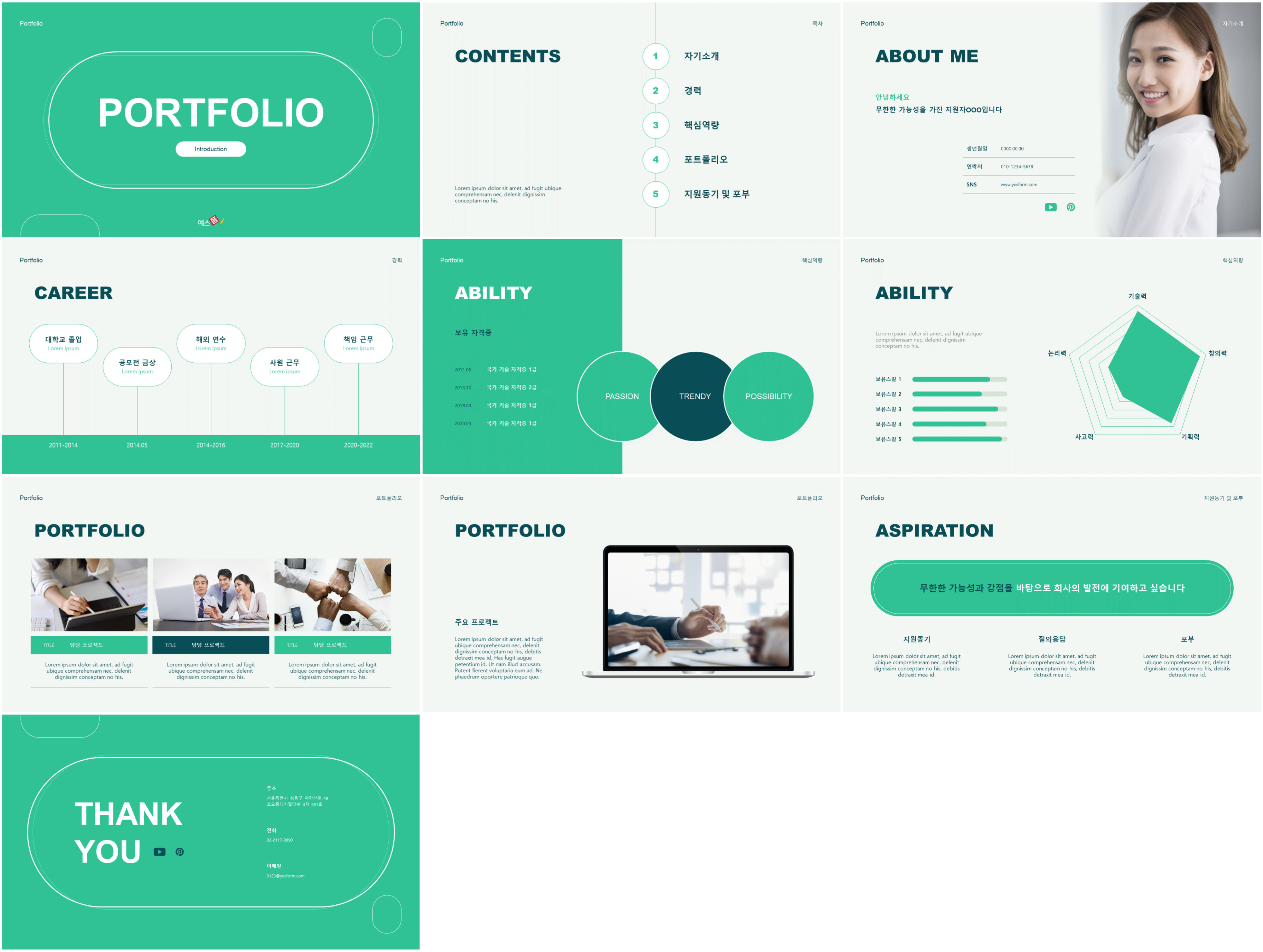 미니멀한 그린 배경을 사용한 자기소개서 파워포인트 템플릿입니다. 비슷한 색감의 컬러를 사용하여 템플릿에 통일감을 주었으며 차트와 다이어그램을 활용하여 나의 직무능력과 포트폴리오를 한눈에 확인할 수 있도록 시각적인 효과를 주었습니다.