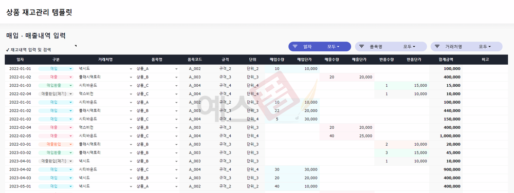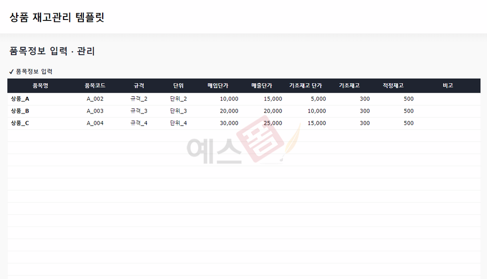 상품 재고관리 템플릿 구글 스프레드시트 - 예스폼 엑셀서식