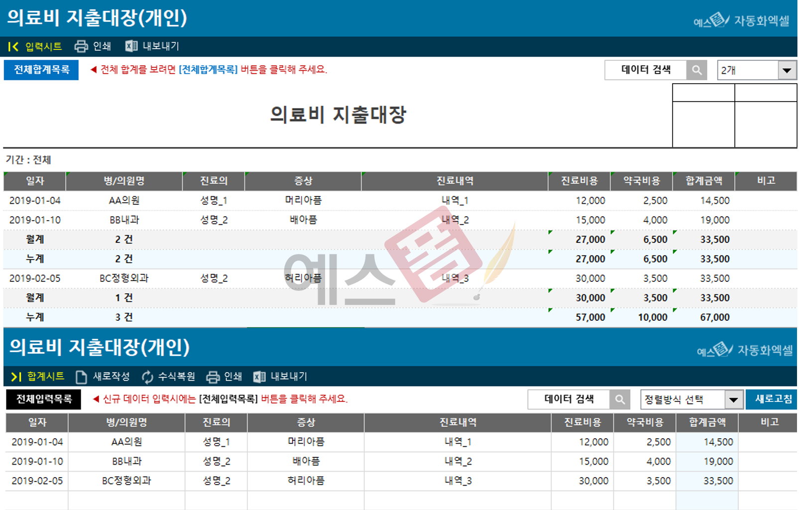 일자, 병/의원명, 진료의, 증상, 진료내역, 진료비용, 약국비용, 합계금액, 비고를 입력할 수 있으며 입력된 데이터값을 근간으로 의료비 합계 금액을 자동산출 할 수 있도록 구성된 콘텐츠입니