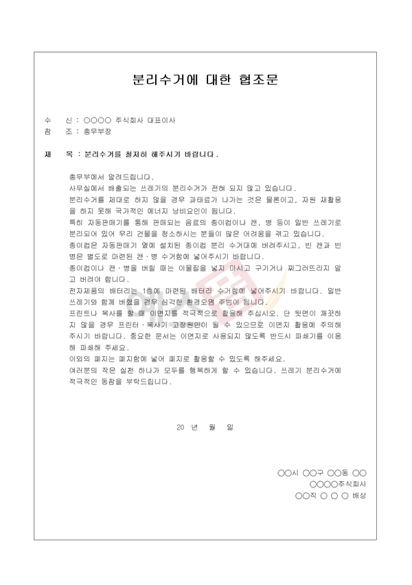 아파트, 공동주택, 사무실 등에서 활용하기 좋은 분리수거 안내문 양식입니다. 올바른 분리수거 분류를 안내하거나 분리수거 쓰레기통을 구분할 때 유용하게 활용하실 수 있습니다. 이미지를 클릭하면 서식 상세페이지로 이동합니다.
