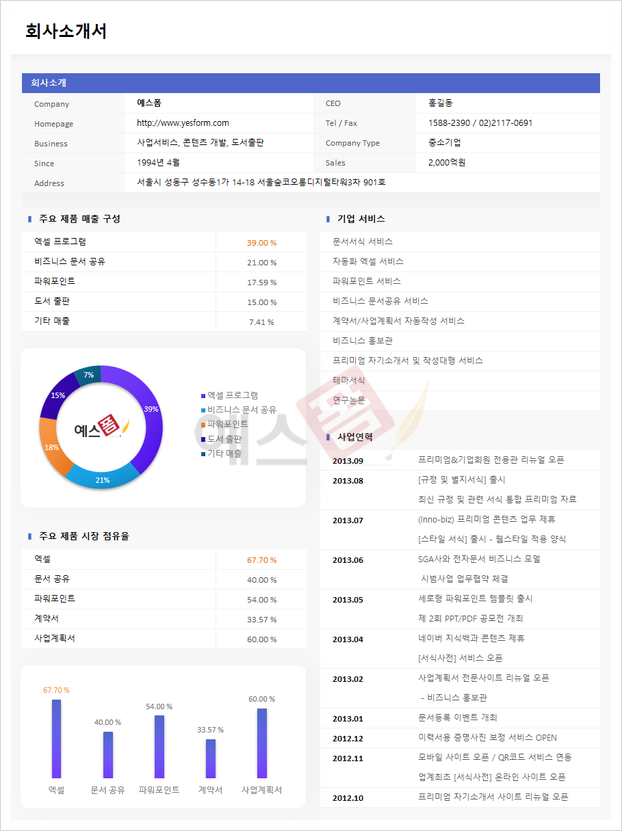 회사소개 / 주요 제품 매출 구성 / 주요제품 시장점유율 / 기업서비스 / 사업연혁로 구성된 회사소개서 서식입니다. 주요 제품 구성비와 시장 점유율을 그래프와 표로 나타내어 가독성을 높였습