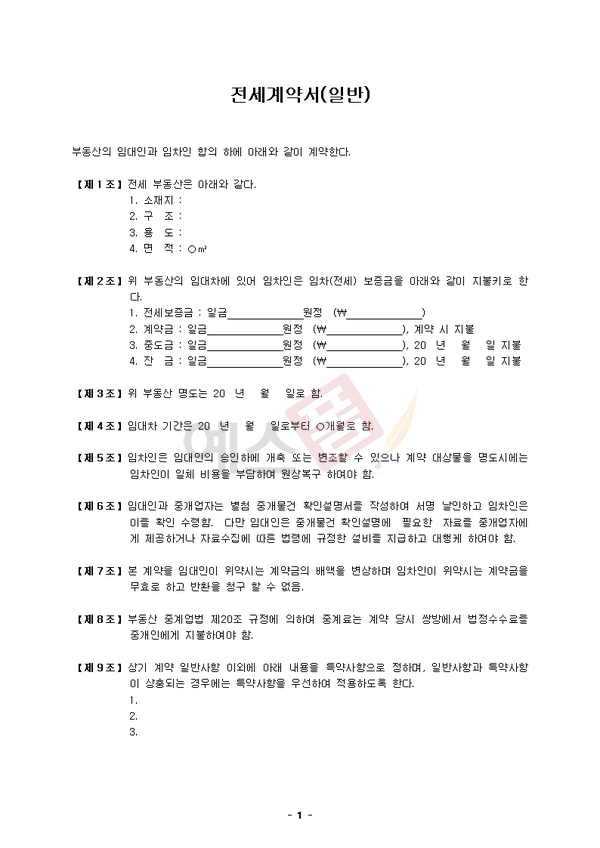 부동산 전세계약서 (중개업자를 두고 계약할 경우) |