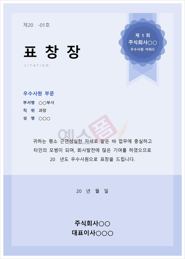 한 해 동안 본인의 업무 분야에서 두각을 나타낸 우수 사원에게 증정하는 표창장 양식입니다. 회사 발전에 기여한 임직원의 공적을 치하하고 감사의 뜻을 전달해보시기 바랍니다.