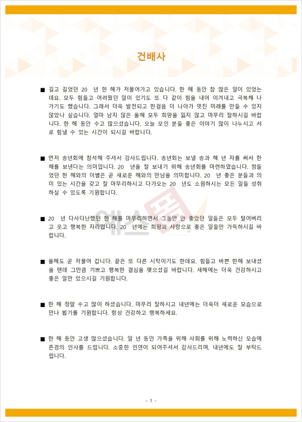 | 종무식 회사대표 인사말 | 종무식 건배사 | 건배사 (서술형) |