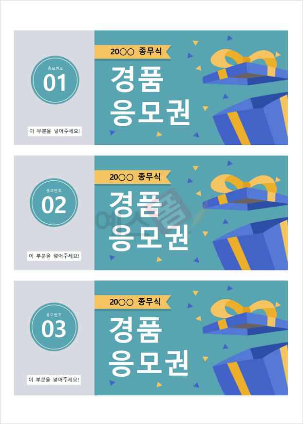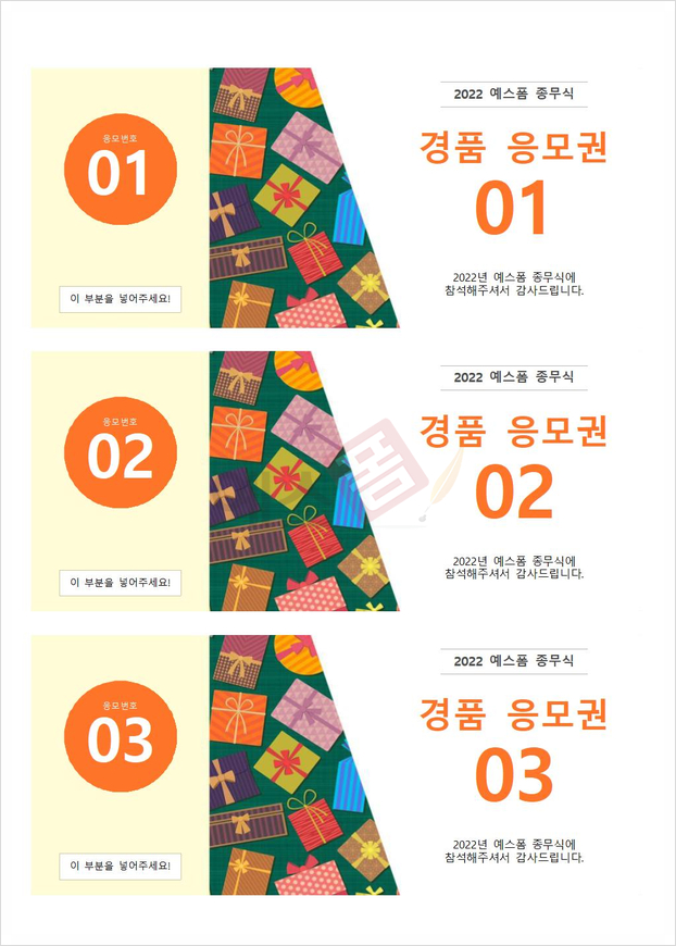 | 종무식 선물 안내문 | 종무식 경품 응모권 | 경품 응모권 (선물 상자) |