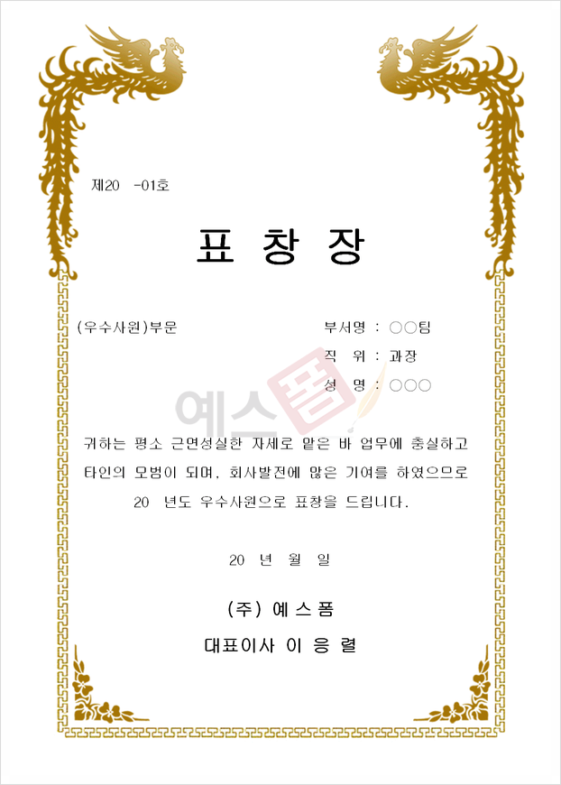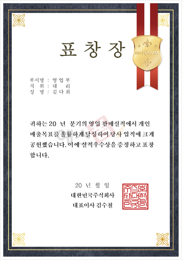 | 우수사원 표창장 (금색, 봉황무늬) | 종무식 표창장 (실적우수상) | 표창장 |