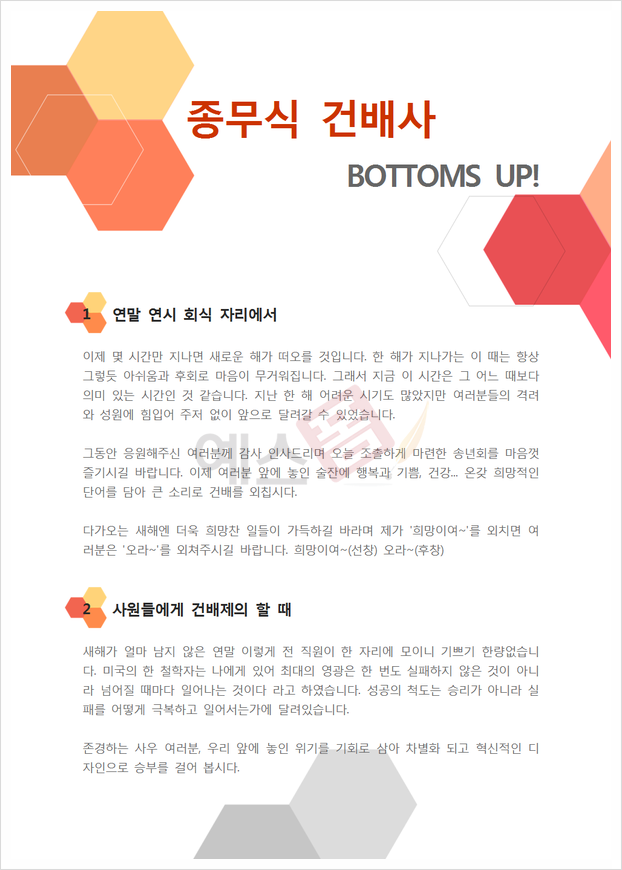 | 종무식 회사대표 인사말 | 종무식 건배사 | 건배사 (서술형) |