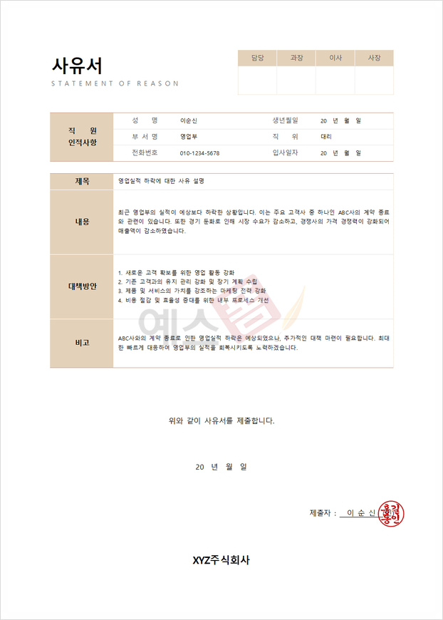 조직 내에서 특정한 사건 또는 상황에 대한 설명과 대응 방안을 문서화한 사유서 양식입니다. 영업실적 하락 사유서 예시 작성이 되어있으며 일반적으로 상급자나 관련 부서에게 상황을 설명하고, 그에 대한 대응책을 제시하기 위해 사용됩니다. 이를 통해 조직 내의 의사소통과 문서화를 강화하여, 효율적인 문제 해결과 상황 관리를 할 수 있습니다.