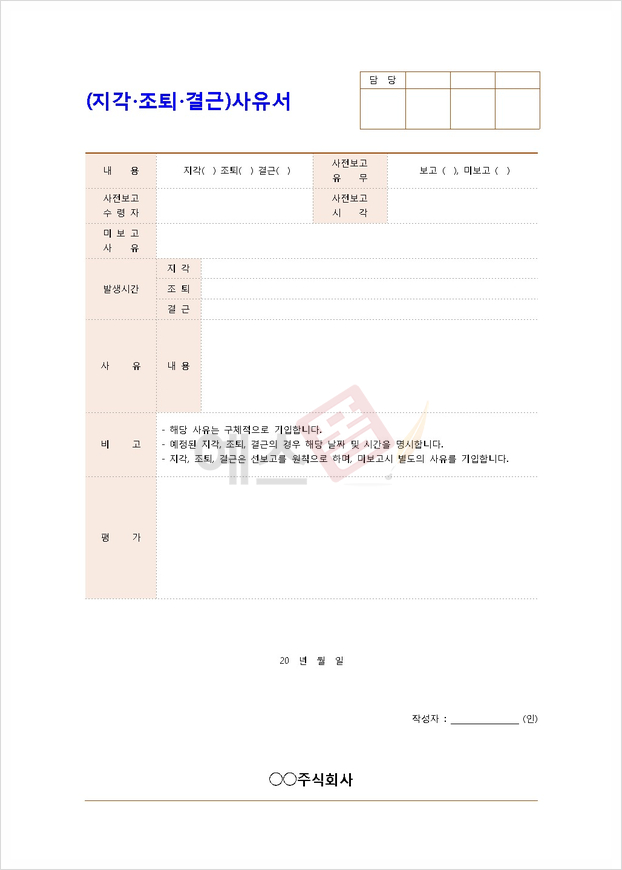 지각 사유서 작성 시에는 지각, 결근, 조퇴 등 해당 원인에 대한 정당한 사유를 기재해야 합니다.