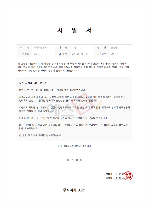 ▼▼ 지각 시말서 양식 바로 가기 ▼▼