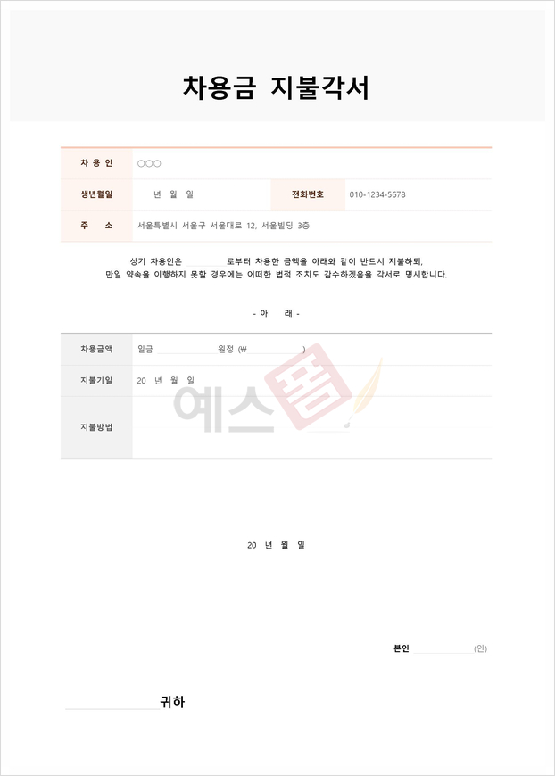 예스폼에서는 차용금 지불각서 양식을 제공하고 있는데요. 해당 양식은 차용한 금액을 지불하고 이행할 것을 각서로 작성하는 양식으로, 차용인, 생년월일, 전화번호, 주소, 차용금액, 지급기일, 지불 방법 등의 내용을 기재할 수 있는 양식입니다. 차용금 지불각서 양식이 필요하실 경우에는 해당 양식을 활용해 보시면 좋을 것 같습니다.