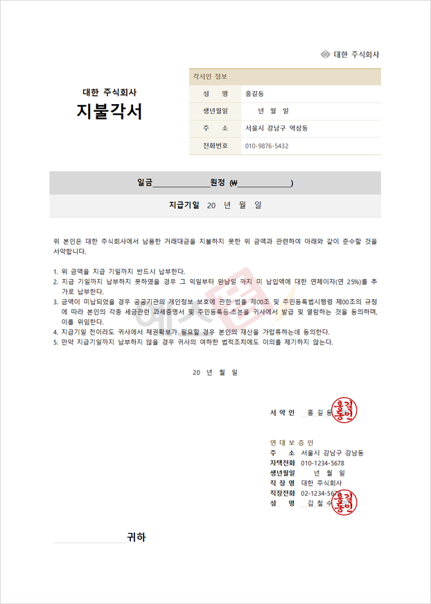 연대보증인 지불각서 양식