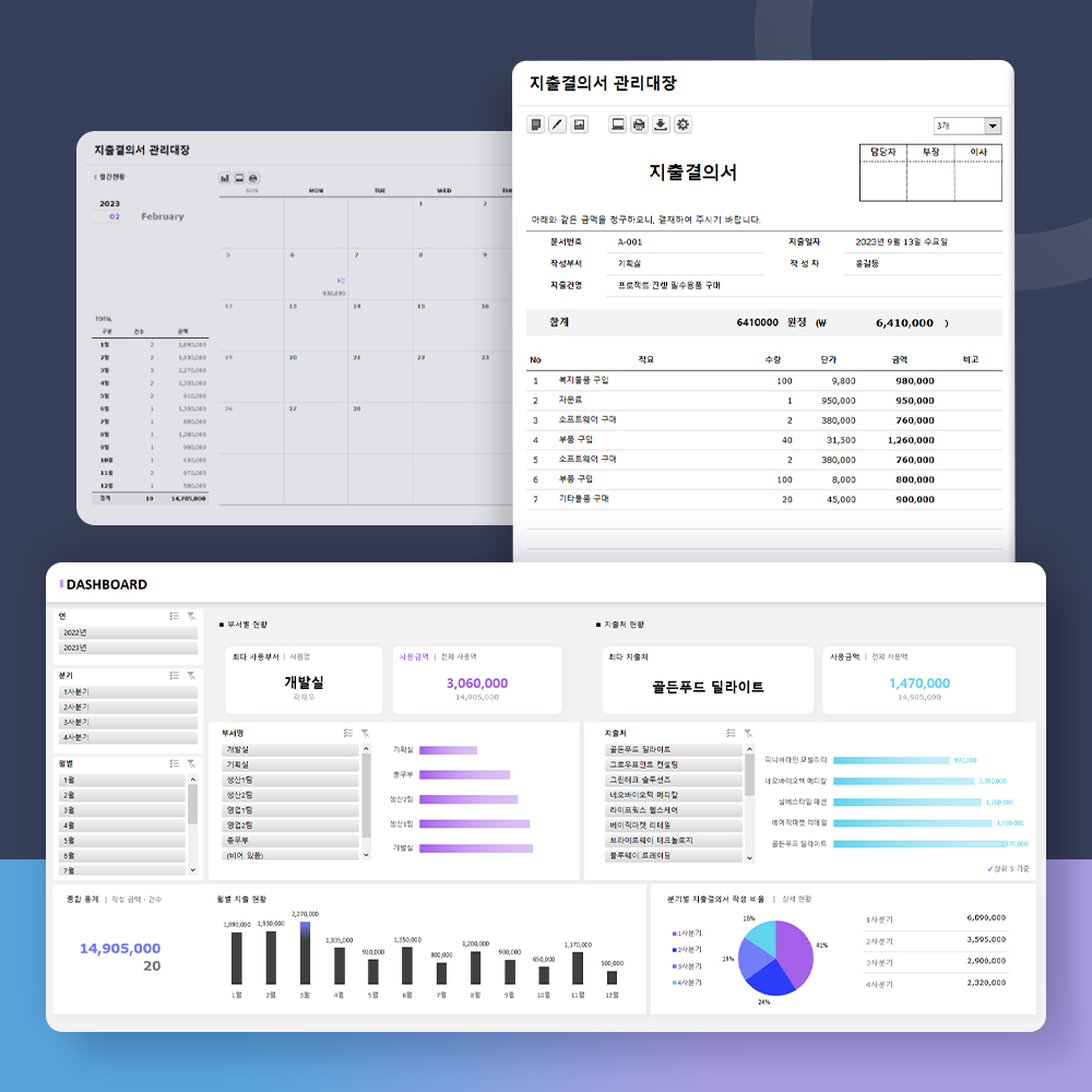 업무 시 필요한 품목 구매에 대한 지출내역을 입력하여 자동작성 되는 지출결의서 서식과 지출내역(일별/월별달력)을 통해 보다 쉽고 편리하게 지출결의서를 작성할 수 있고 지출에 대한 정보