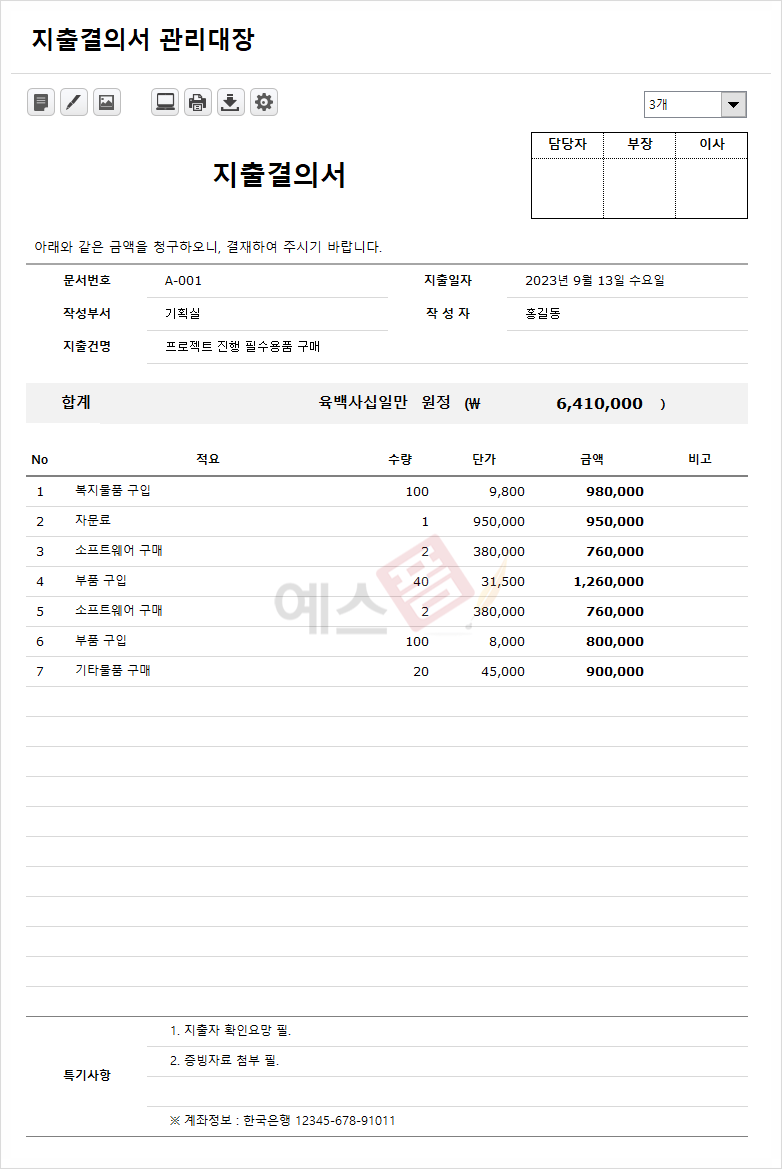 지출결의서 간편작성 엑셀프로그램(지출품의서 작성, 자동저장/검색, 연간 지출관리) - 예스폼