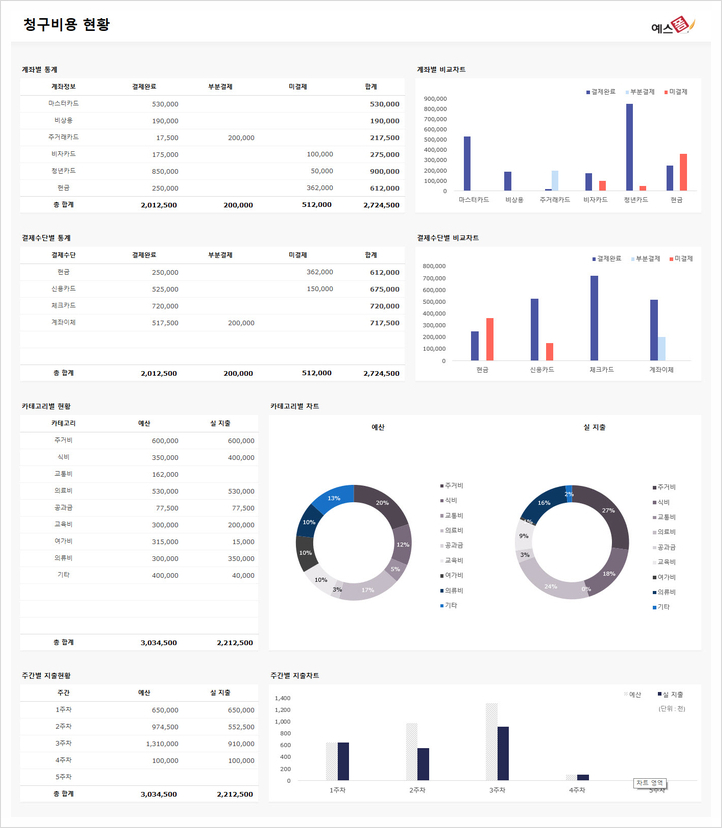 지출 청구서 관리표, 월간 지출예산 현황표 등 각종 현황표와 차트로 지출 내역을 확인할 수 있으며 모두 구글 시트로도 사용이 가능하니 하단에서 확인해 보시고, 간편한 사용법과 세련된 디자인을 갖춘 예스폼 지출 관리 대장 엑셀 템플릿으로 여러분의 재정 관리를 스마트하게 변화시켜 보시길 바랍니다!