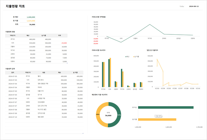 카테고리별 지출 내역 입력을 통해 차트로 통계 확인이 가능한 지출 현황 차트 템플릿입니다.
