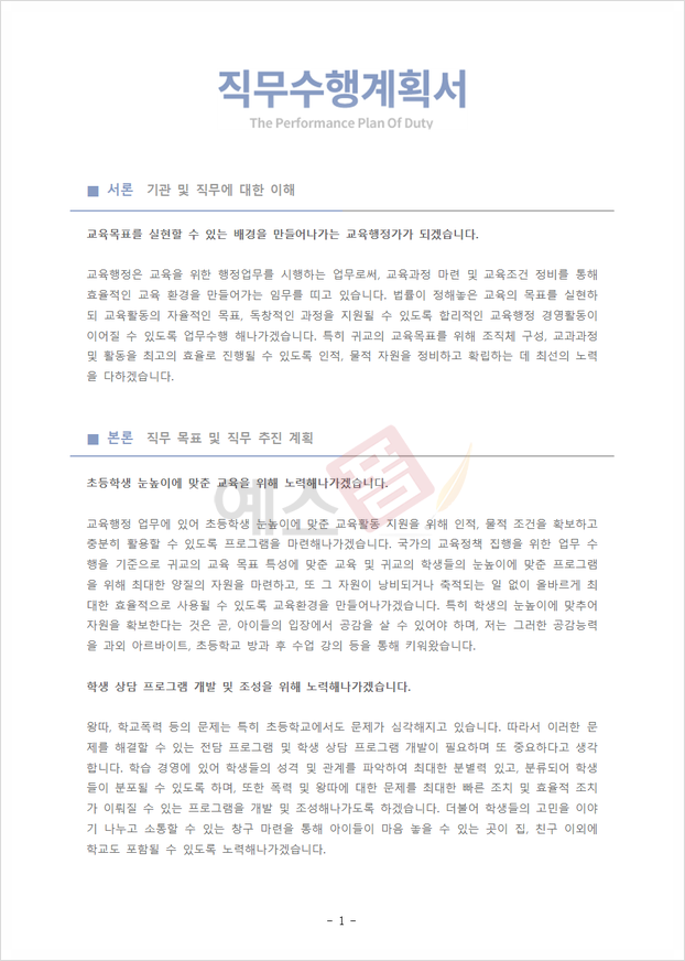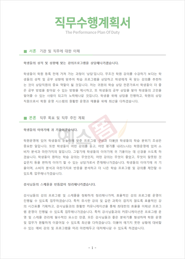 직무수행계획서 예시 (교육행정/학원) |